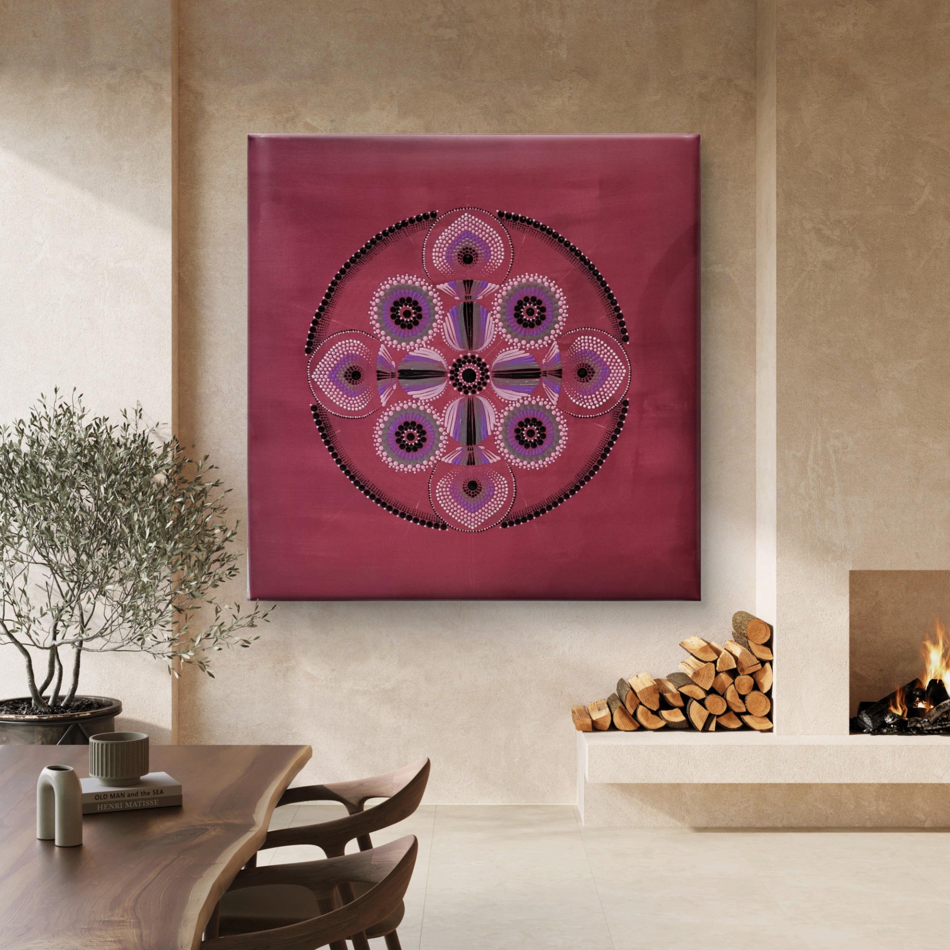 A cseresznyefényű, metallic vörös háttér egyszerre hordoz életet, pulzálást és mélységet, miközben a középpontból kifelé épülő forma a belső rendet, a védettséget és az érzelmi összetartozást idézi meg.