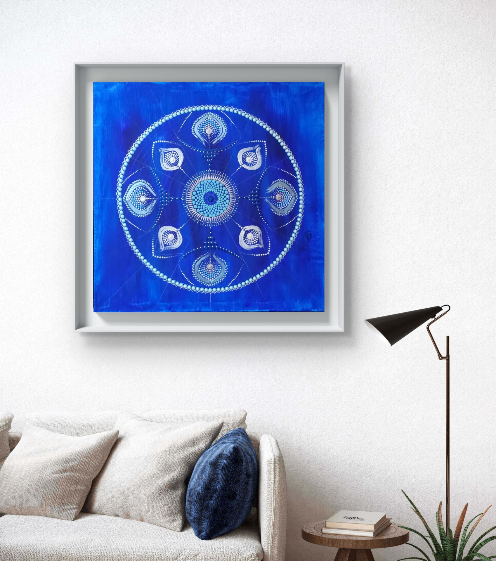 A kép inspirációjában egy szelíd, mégis erőt sugárzó farkas jelent meg, mint őrző jelenlét — nem fenyegetőként, hanem kísérőként. Egy olyan ösztönös belső erőként, amely védi a sérülékenyebb, tisztább, alkotó részt. A mandala így nem csupán formai kompozíció, hanem egy érzésből született, személyes belső tér is.